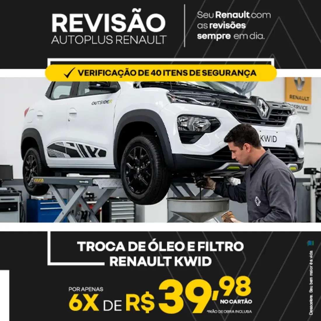 Os serviços de pós-venda da Renault combinam confiabilidade, qualidade e transparência. Nosso time é altamente treinado para cuidar do seu veículo com peças originais e dentro dos padrões da marca. Com atendimento transparente, garantimos a melhor experiência para você e seu Renault.